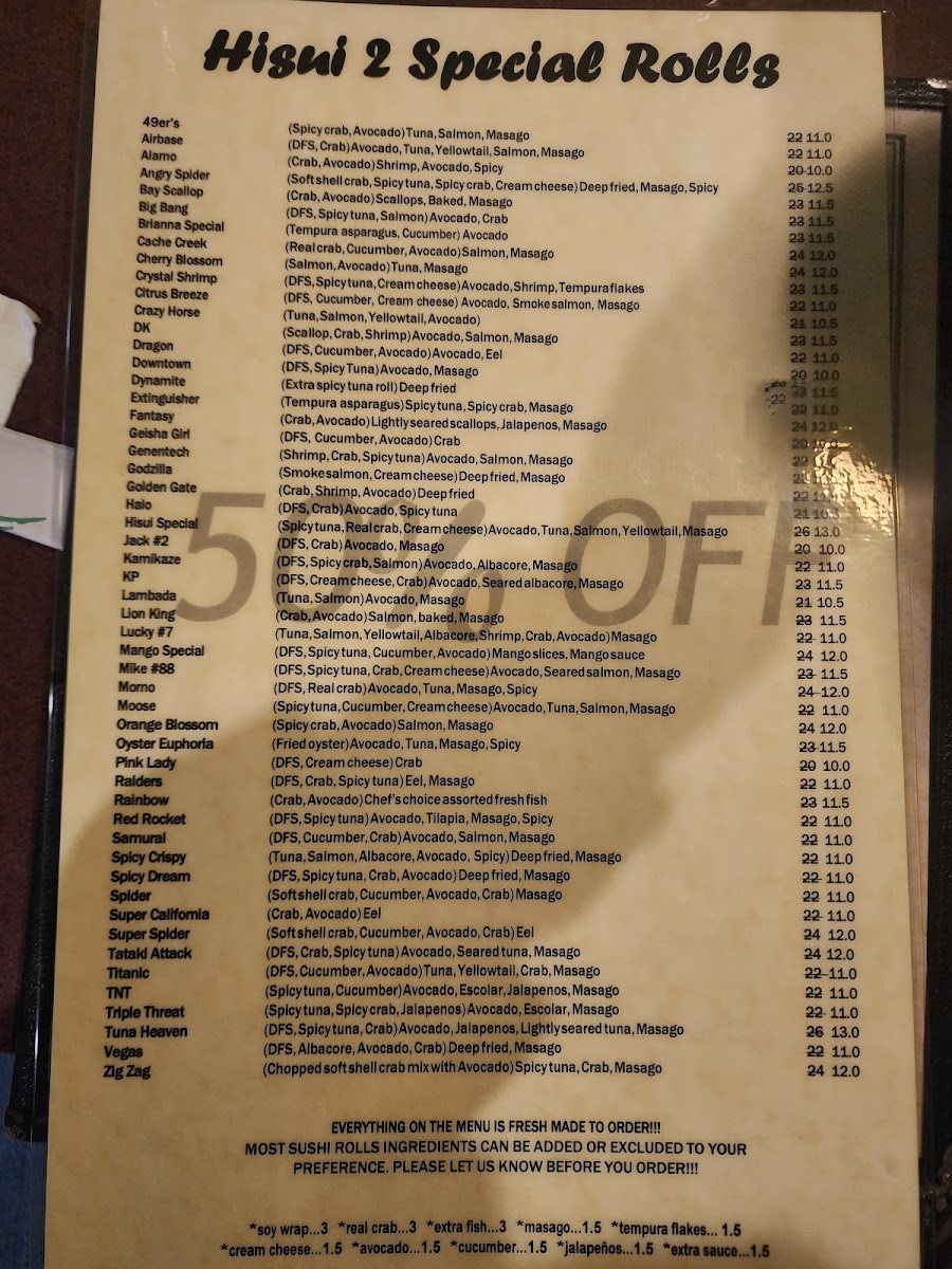 Introducing Hisui 2, a hidden gem located at 3001 Alamo Dr, Vacaville, CA, where culinary delight meets a welcoming atmosphere. This vibrant sports and sushi bar offers an affordable all-you-can-eat buffet that has earned rave reviews from patrons. Guests like David Sandberg praise the amazing quality at exceptional prices, while Tehya Christie highlights the consistent perfection of their carefully crafted sushi rolls.
